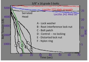 A very compelling comparison is illustrated in this plot showing how chemical threadlockers are superior at maintaining bolt tension (as measured in a specially designed test rig). They also provide an installation lubricity benefit that insures more consistent installation torque. Tim reviewed the Loctite products that provide a range of locking strength and sealing. Finally, Tim had a great story about the best unauthorized T shirt slogan – “Use Loctite or kiss your nuts goodbye”